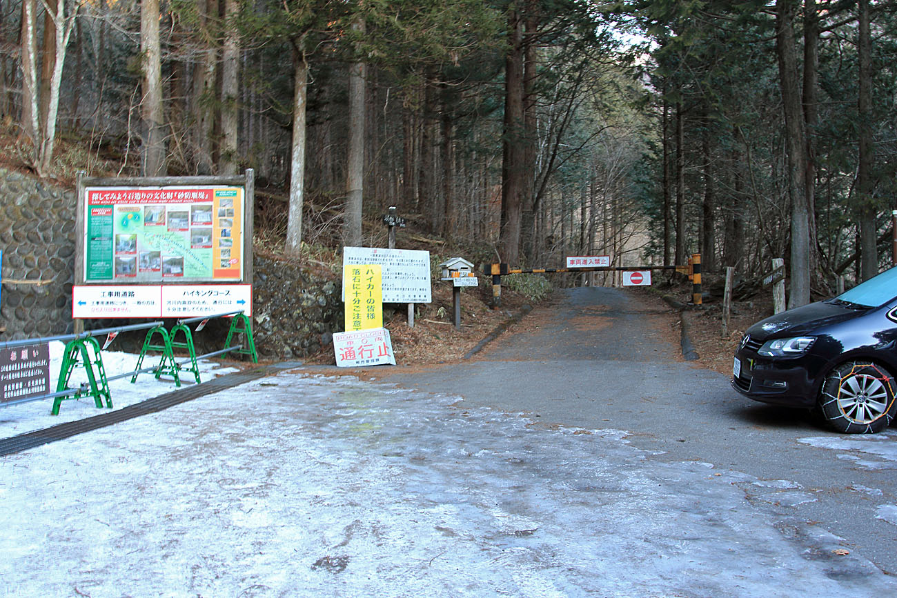 この林道は登山口からこの地点まで一般の方の立ち入りが禁止になっており、ここが規制の終点で、この先、雲竜渓谷への道は規制対象外となっている。