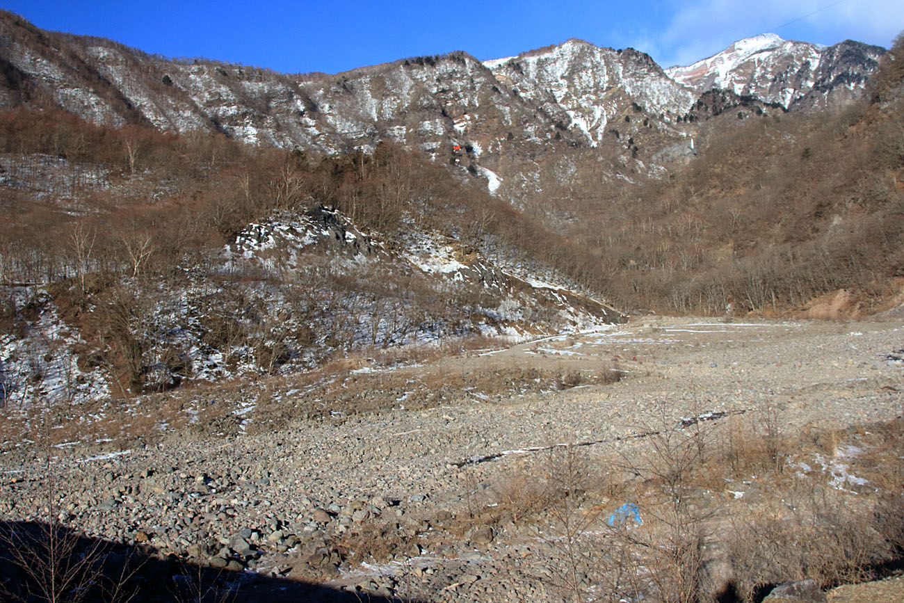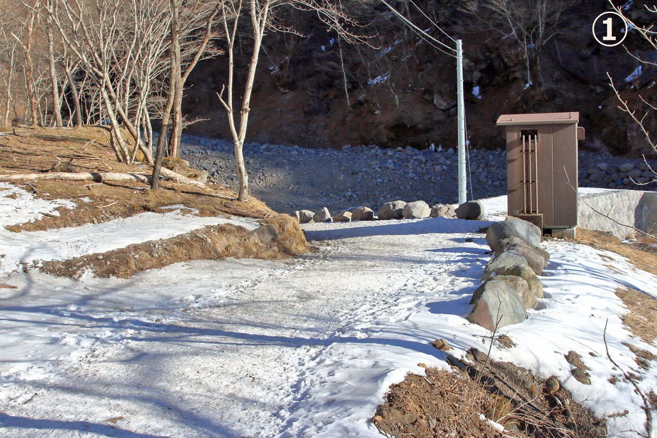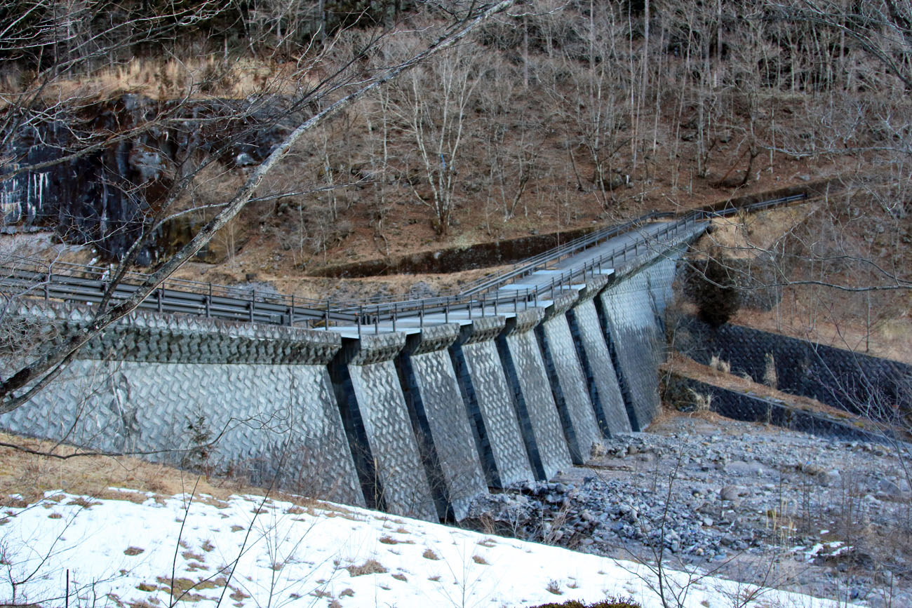 砂防堰堤内には工事車両向けの道路が作られており、1か所だけ渡渉がある。約1mほどの水路だが、渡渉個所はいくつもあり、落ちないよう慎重に足を運ぶ。