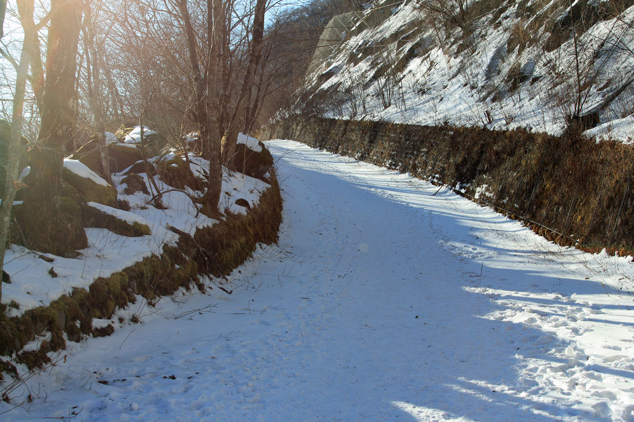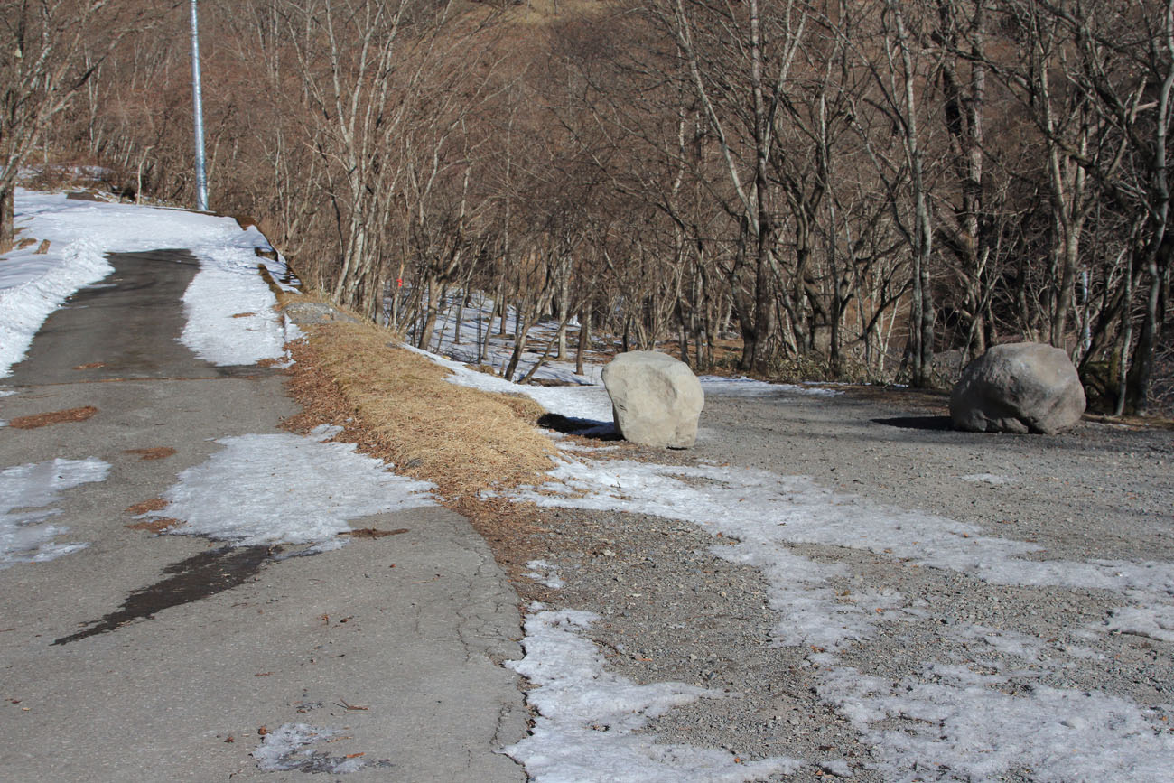 林道は、アスファルト舗装で除雪されており、道路中央部はほぼ雪が解けている。