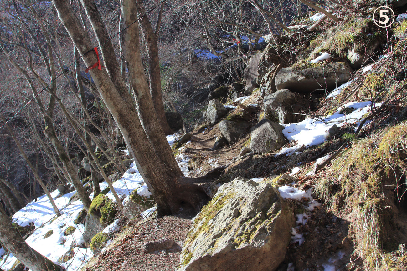 ⑤すぐに左に曲がり、岩混じりの疎林内に入って行く