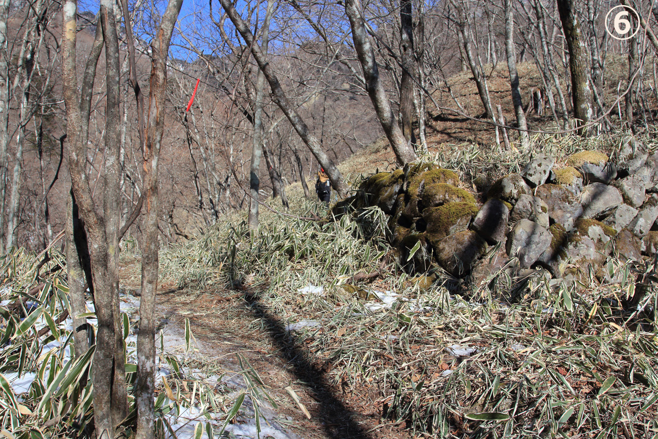 ⑥岩混じりの疎林内を行く