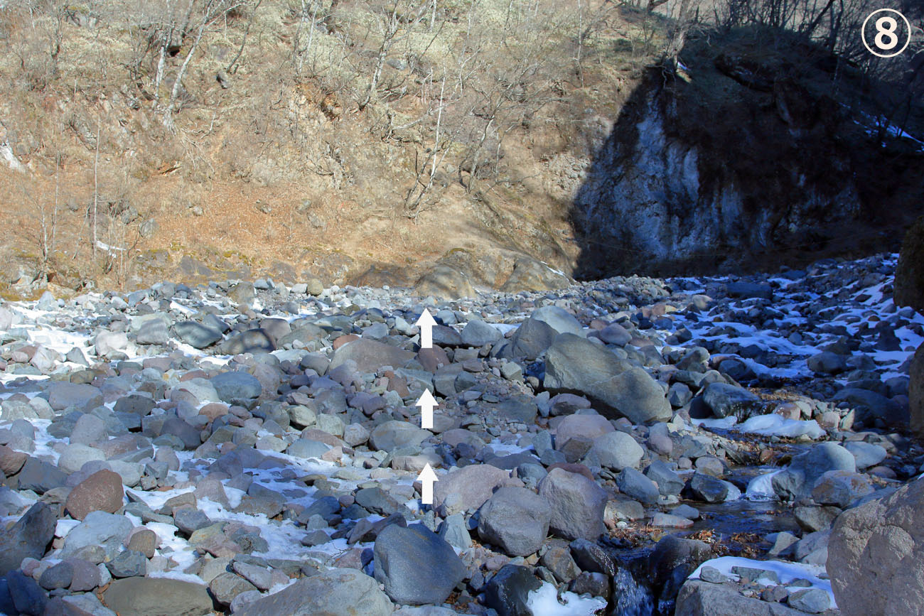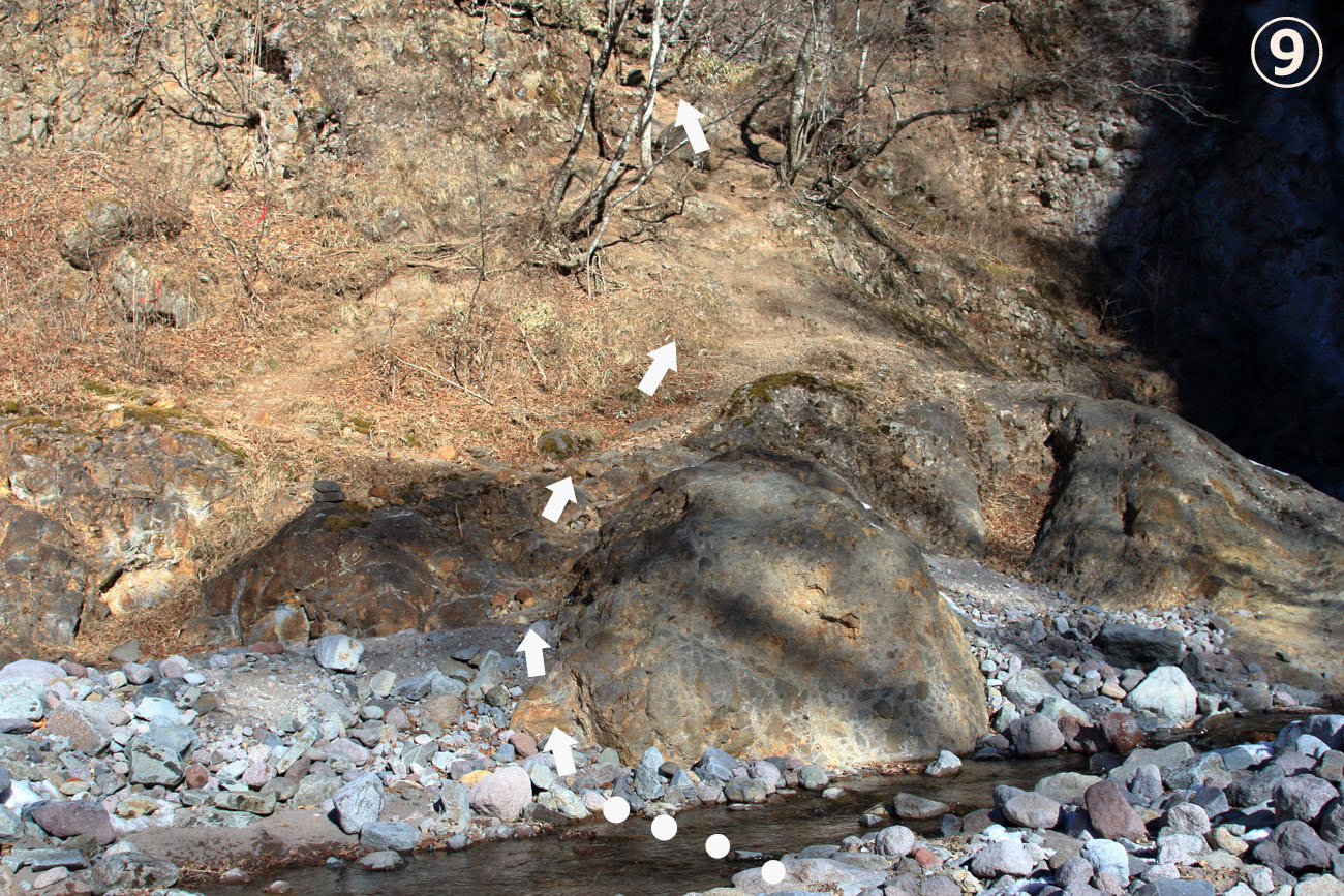 ⑨右岸にある大きな岩の脇を通り、登っていく。