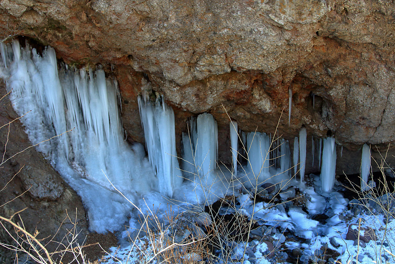 ②燕岩:2004年-太い氷柱が7本、槍のように鋭い氷柱がたくさん。2018年-太い氷柱が見ごたえあり。2026年-太い氷柱が3本、鋭い氷柱はまばら。