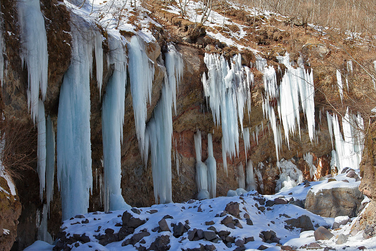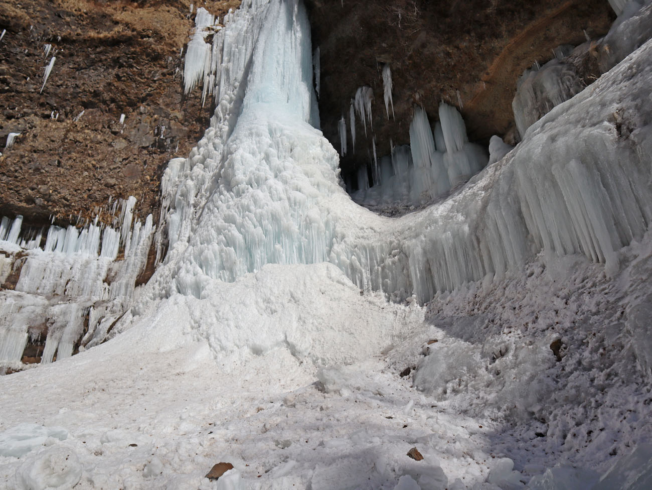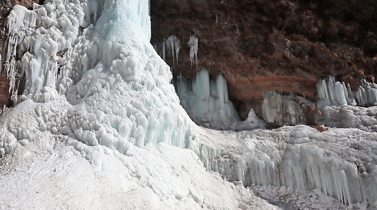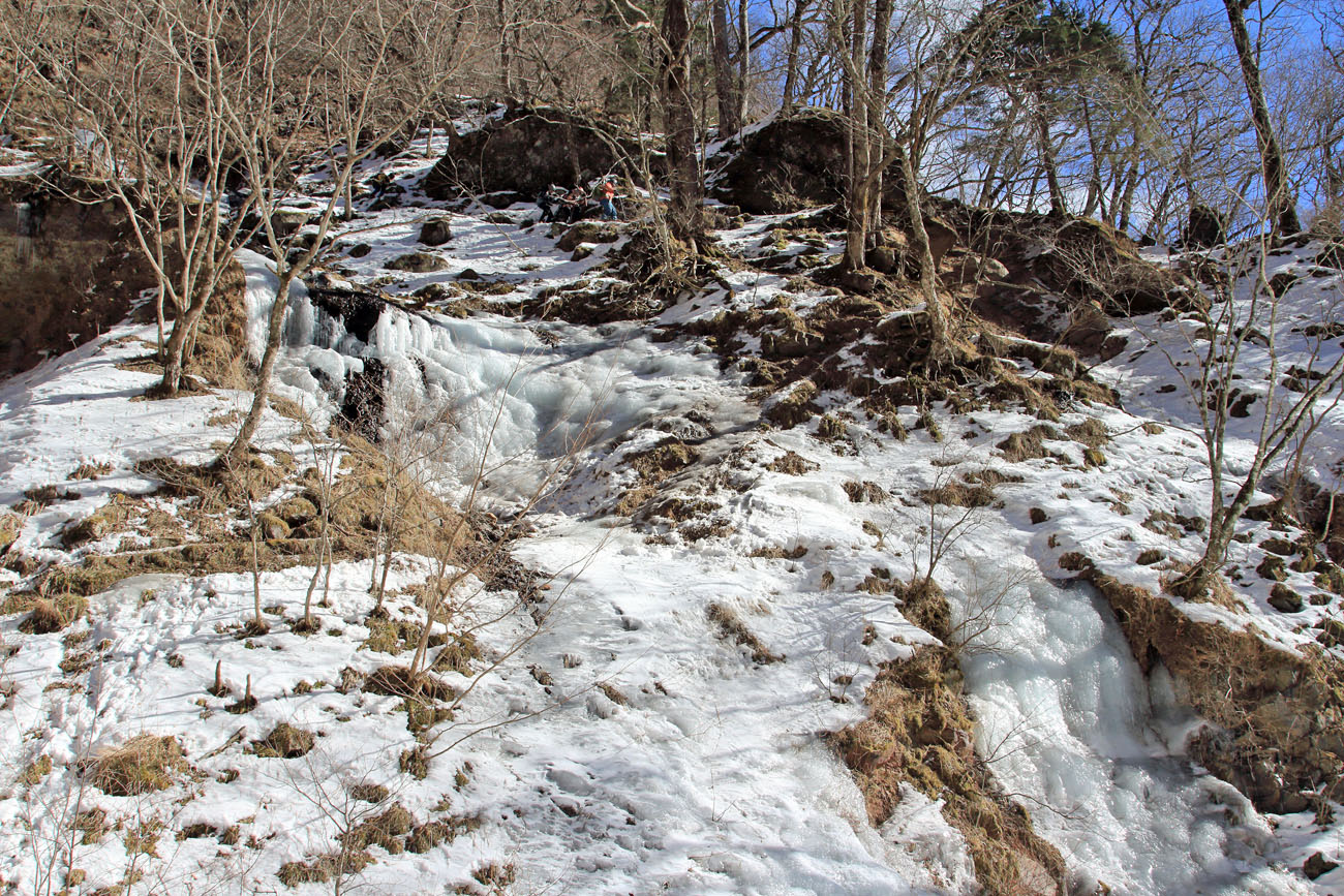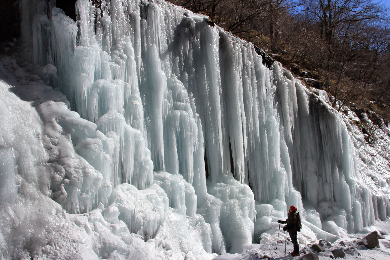 ここは岩が棚状になっており、ステージを感じさせる。上から落ちる水が凍り付いて、鋭い氷柱を何本も連続して作られる。