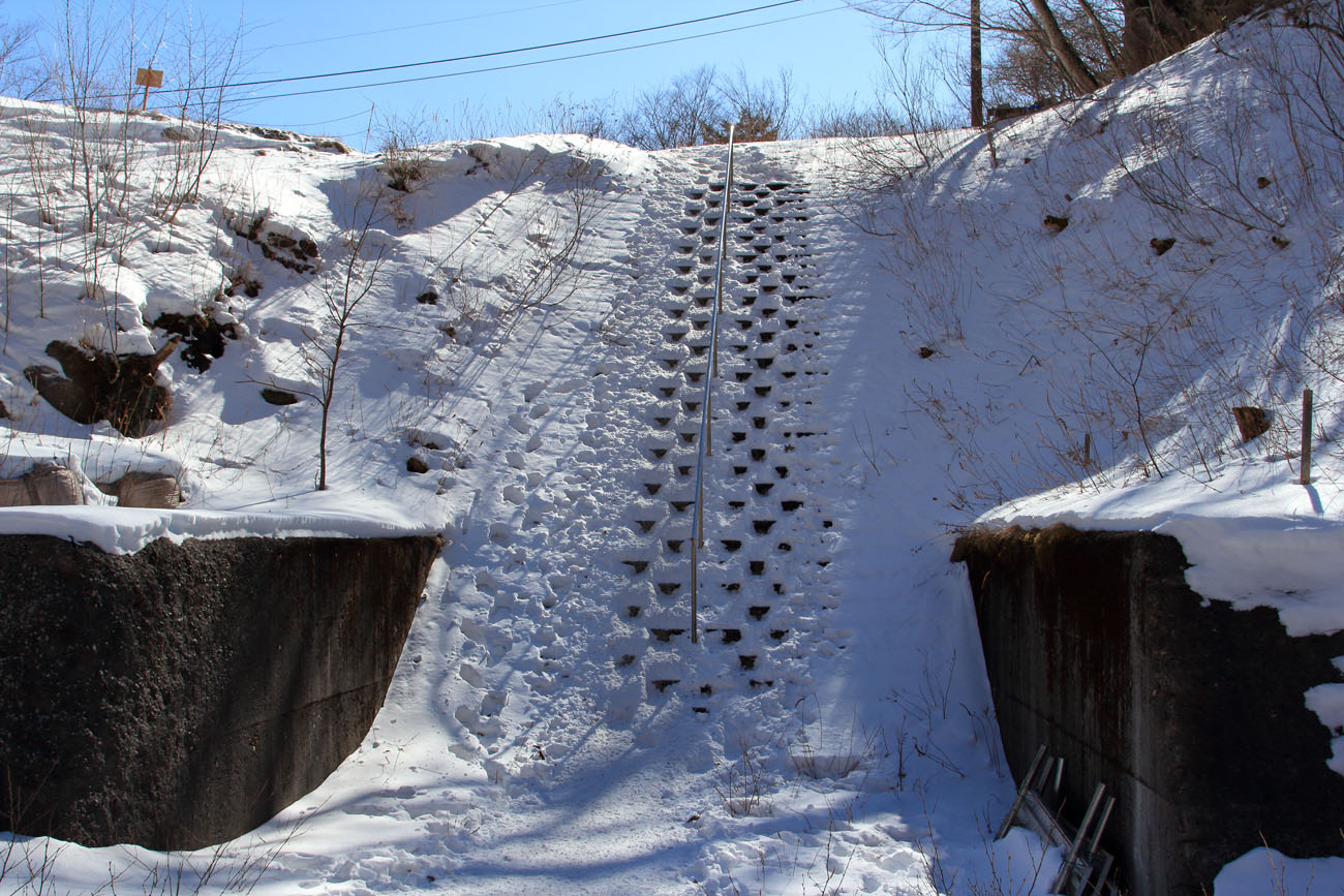スタート時の道はアイスバーンの急坂を登る。道と言っても平地の安定した道ではない。雪が多めのときは、踏み跡が階段状に造られ、やや安心感があるが、今日はアイスバーンが丸出しだ。