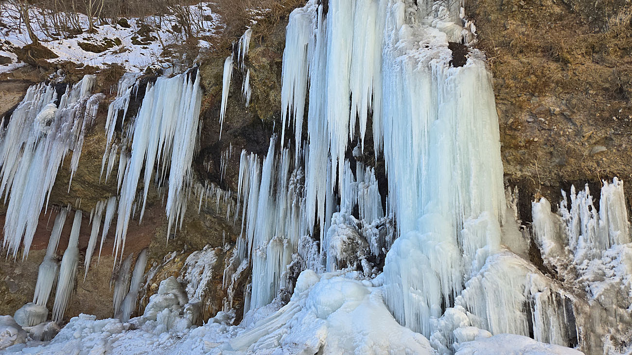 しかし、以前に訪れた22年前と8年前の様子を比べると、明らかに氷柱の出来具合が悪い。大きな柱が何本もできる。槍のように鋭い氷柱も数が少なく見栄えが悪い。これも気候変動の影響を少なからず受けているのだろうか。