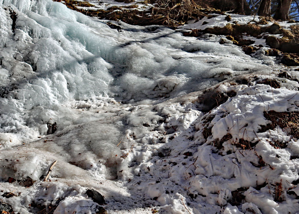 そのため、写真下部の濁った氷柱のすぐ前から右手のアイスバーン状の急坂を登ることから始まる。